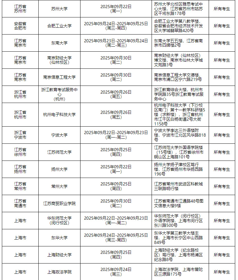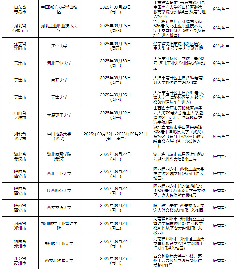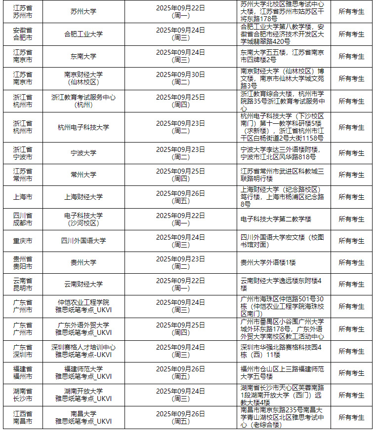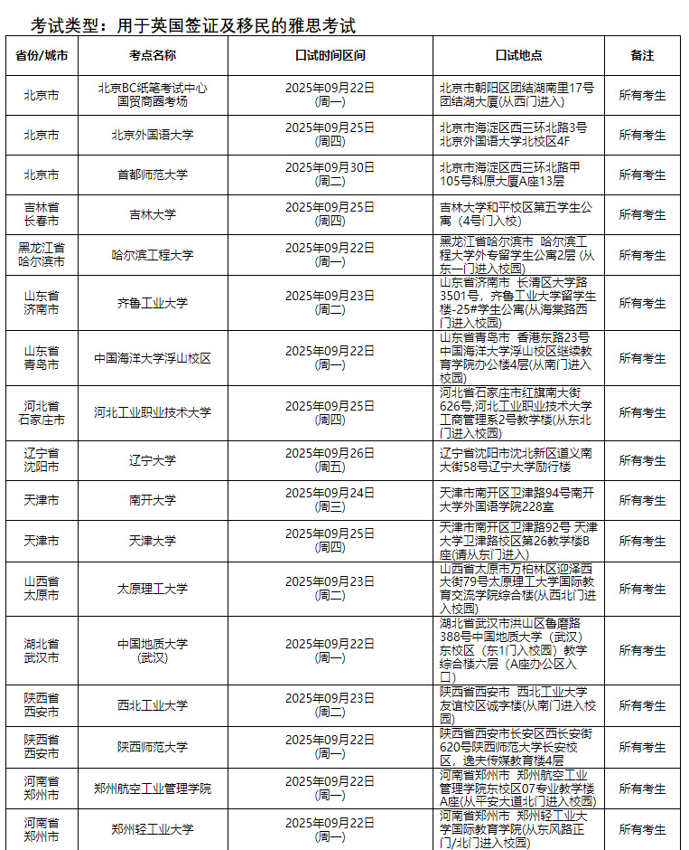 根据考试工作有关安排,雅思考试(2025年9月27日)各考点口语考试时间区间如下。请考生在准考证打印时间内登录报名网站查询本人考试时间并打印准考证,最终考试时间请以准考证上通知为准。