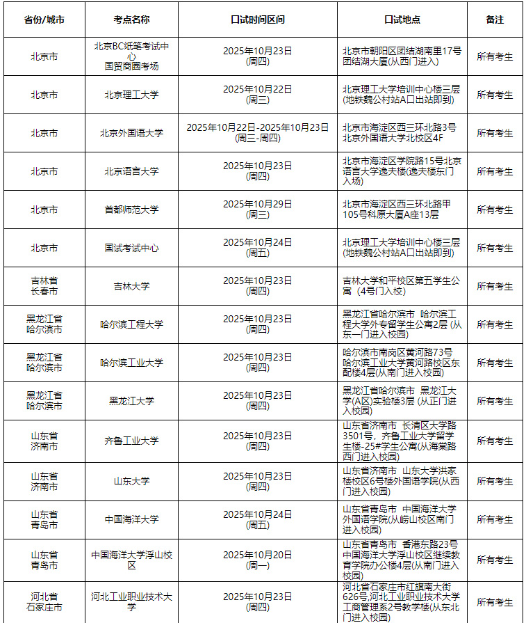根据考试工作有关安排,雅思考试(2025年10月25日)各考点口语考试时间区间如下。请考生在准考证打印时间内登录报名网站查询本人考试时间并打印准考证,最终考试时间请以准考证上通知为准。