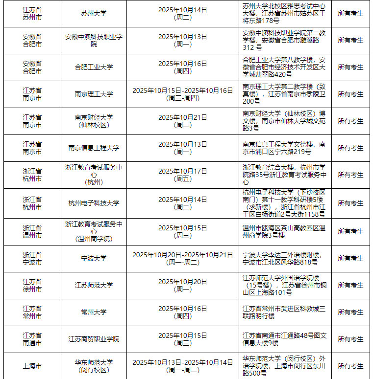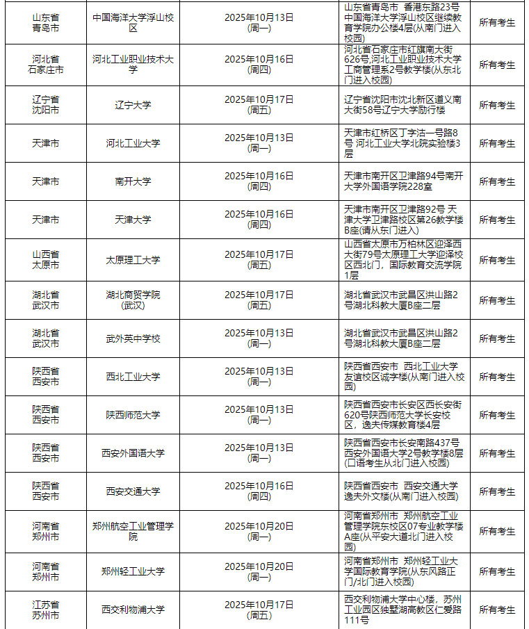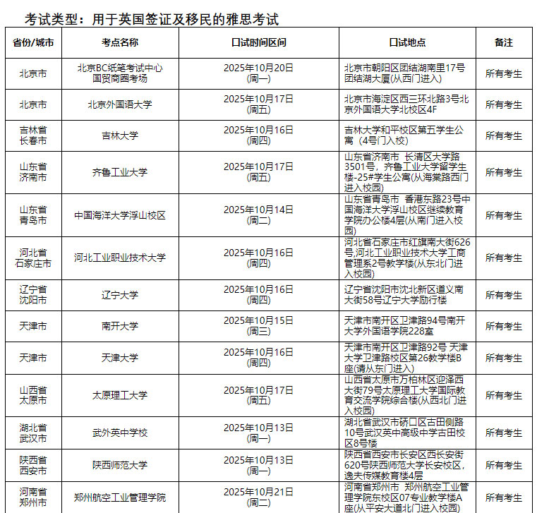 根据考试工作有关安排,雅思考试(2025年10月18日)各考点口语考试时间区间如下。请考生在准考证打印时间内登录报名网站查询本人考试时间并打印准考证,最终考试时间请以准考证上通知为准。