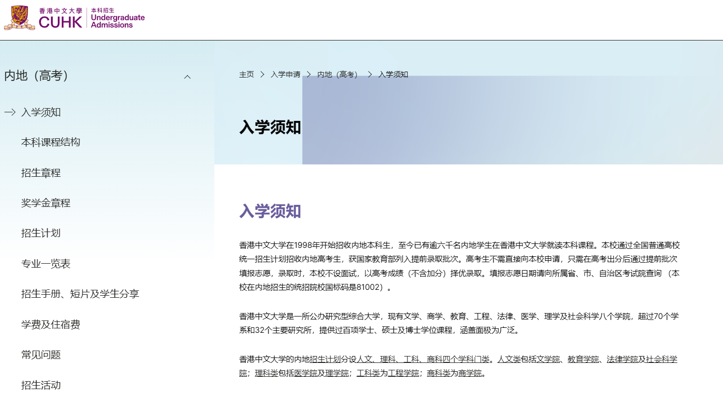 香港城市大学悄然退出内地高考统招,令港中文成为“港八大”中通过该途径招生的“独苗”。顺便帮大家看一眼港中文的情况,官网依然显示通过高考统招招收内地高考生: