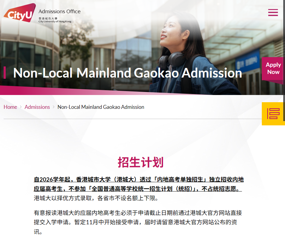 自2026学年起,香港城市大学(港城大)透过「内地高考单独招生」独立招收内地应届高考生,不参加「全国普通高等学校统一招生计划(统招)」,不占统招志愿。港城大以择优方式录取,各省市不设名额上下限。