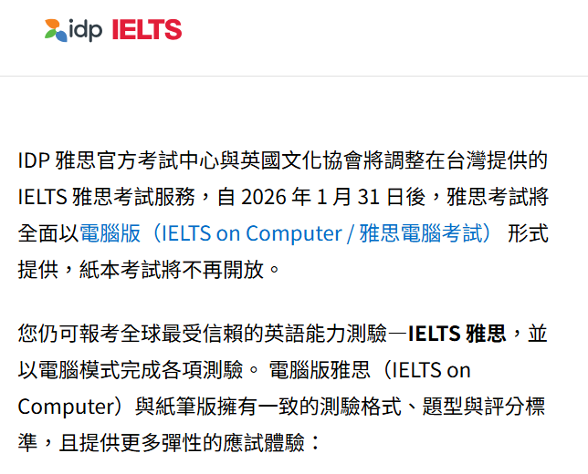 IDP雅思官方正式官宣将调整在中国台湾地区提供的雅思考试服务——自2026年1月31日起全面切换机考模式,纸笔考试将不再开放。