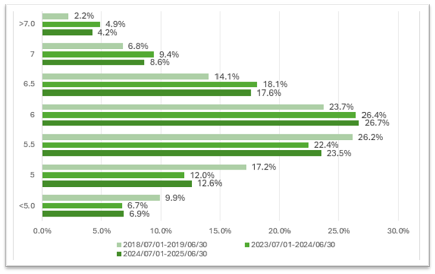 (数据来源:英国文化教育协会中国大陆地区学术类雅思考生成绩大数据,统计周期:2024年7月1日至2025年6月30日)