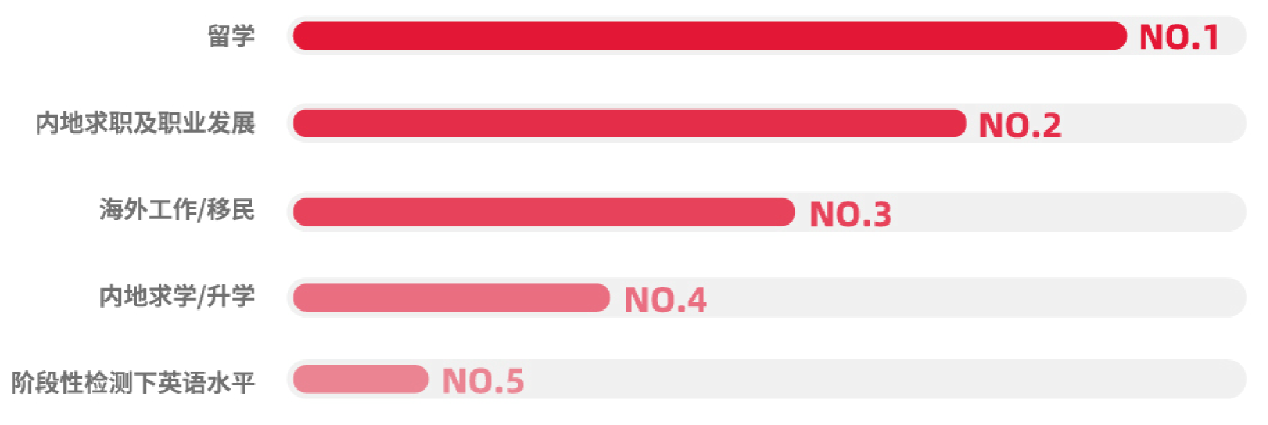 调研数据显示,“海外留学”依然是中国大陆地区考生报考雅思的核心动因。无论是申请英、美、加、澳、新等传统留学目的地,还是选择欧洲、亚洲等新兴留学地区,雅思成绩都是院校评估英语能力的核心标准之一。