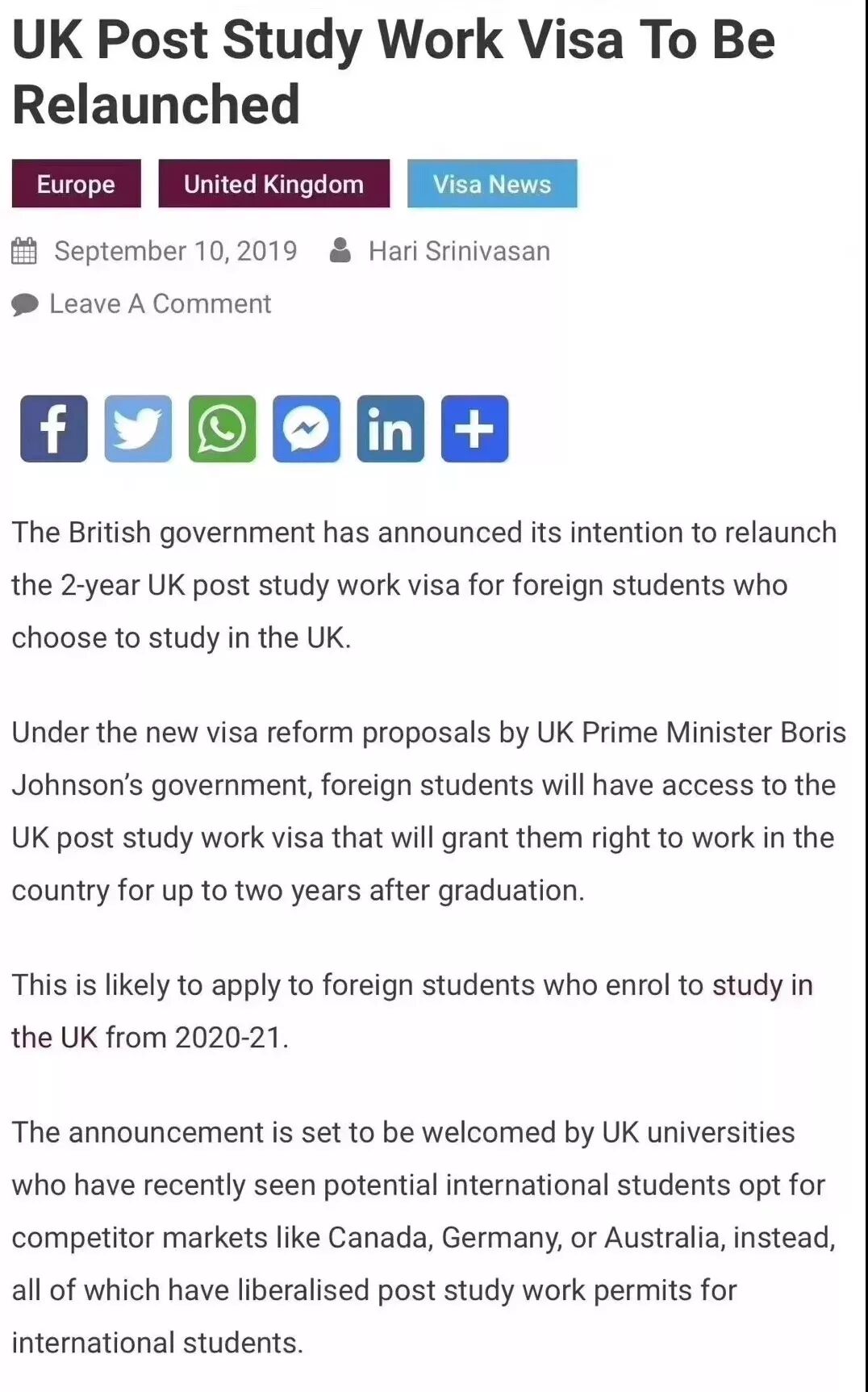 “ 英国政府宣布将恢复取消七年的PSW签证,英国留学生毕业后可在英国工作两年,英国留学迎来重大利好。”